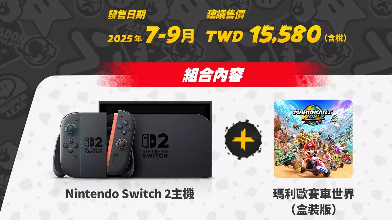 Nintendo Switch 2 將於 2025 年 7 月 10 日(四) 在台灣上市,首波提供兩種版本:標準版建議售價為 新台幣 14,380 元,另有搭載《瑪利歐賽車世界》數位下載版的組合包,建議售價為 新台幣 15,580 元。