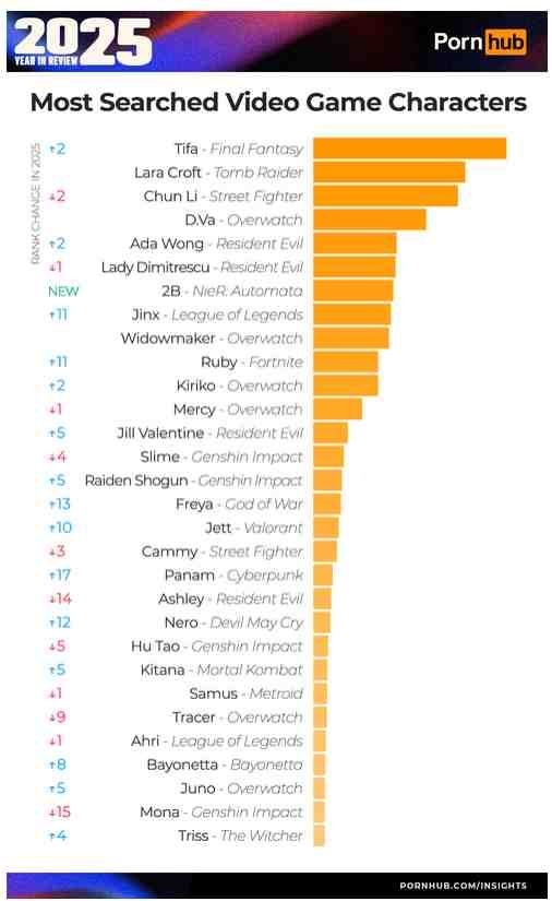 在這個世界上,除了遊戲之外,能帶來單純又奇妙快樂的事情已經不多,而 Pornhub 每年公開的電子遊戲以及角色的搜尋數據絕對堪稱其中一項經典儀式!今年的 SFW(安全版)年度統計再次公開,也再度揭露了全世界網友在深夜最真實的慾望風向。從遊戲角色到整部作品,這份排行榜永遠像一面映照文化流行趨勢的鏡子,只不過這面鏡子更坦誠、更直白,也更有趣。多年來,Pornhub 的遊戲角色排行榜大多呈現女孩們輪流坐莊的局面:名次會互換,但那幾位永遠在榜上。今年的冠軍也不例外,依舊由遊戲圈熟面孔奪下:《Final Fantasy VII》的蒂法成功超車《快打旋風》的春麗,以壓倒性熱度坐上年度第一名。 春麗則屈居第二,繼續展現格鬥界傳奇美腿的跨世代魅力;至於常年在榜,來自《古墓奇兵》系列的蘿拉 Lara Croft,依然穩定如老朋友般停在第二名上下的位置,牢牢占據著排行榜前段。但今年榜單也並非毫無驚喜。《尼爾:自動人形》的 2B 首度進榜就直接殺入前列,儘管近期沒有任何新主線作品推出。似乎是隨著《劍星》以及《Final Fantasy VII Ever Crisis》等作品近期與《尼爾》合作活動陸續出現 2B 的影子的關係,讓玩家再度想起這位黑白配色的經典角色,進而把她推上排行榜。 另一方面,《英雄聯盟》的 Jinx 今年也呈現爆炸性成長,《奧術》動畫第二季的持續熱度與拳頭新作《2XKO》的關注,毫無疑問成了她衝榜的最佳助力。而在「遊戲搜尋度」方面,今年的變動更加劇烈。《原神》成功超越《要塞英雄》,躍升成 Pornhub 上全球最常被搜尋的遊戲,這一點倒是不讓人太意外。畢竟官方每年推出大量角色、各種遊戲內外合作,再加上長期的跨平台熱度,《原神》自然成了成人搜尋榜單上的永久熱門詞。《鬥陣特攻》依舊穩居第四名,而這毫無疑問與 D.Va 在榜單上的歷史性強勢存在有著密不可分的關聯。本次最亮眼的黑馬無疑是《漫威爭鋒》。這款還在熱度延燒的新興射擊遊戲,竟在首次納入榜單的年度就一路衝上第六名,可見角色設計與社群熱度雙雙成功吸引全球玩家的「注意」。 不僅如此,榜單也似乎透露出某種世代更替:格鬥遊戲勢力似乎正在成人領域逐漸式微,《快打旋風》與《真人快打》分別往後掉了一到兩個名次。這代表格鬥遊戲過去在此類榜單的長期稱霸時代,正悄悄地讓位給射擊、MOBA 與跨平台遊戲的新秀們呢…Pornhub 的年度搜尋排行向來是一面奇妙又真實的文化觀察器。今年不只映照出玩家偏好,也反映出角色人氣、遊戲風潮、動漫影響力、甚至合作活動的外溢效應。你或許永遠不會承認自己看過這份榜單,但它總能悄悄揭開遊戲文化另一面的潮流脈動。