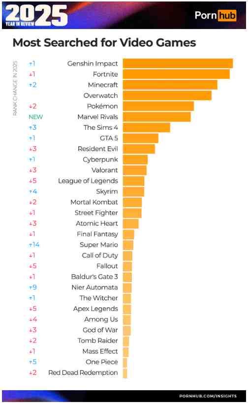 而在「遊戲搜尋度」方面,今年的變動更加劇烈。《原神》成功超越《要塞英雄》,躍升成 Pornhub 上全球最常被搜尋的遊戲,這一點倒是不讓人太意外。畢竟官方每年推出大量角色、各種遊戲內外合作,再加上長期的跨平台熱度,《原神》自然成了成人搜尋榜單上的永久熱門詞。《鬥陣特攻》依舊穩居第四名,而這毫無疑問與 D.Va 在榜單上的歷史性強勢存在有著密不可分的關聯。