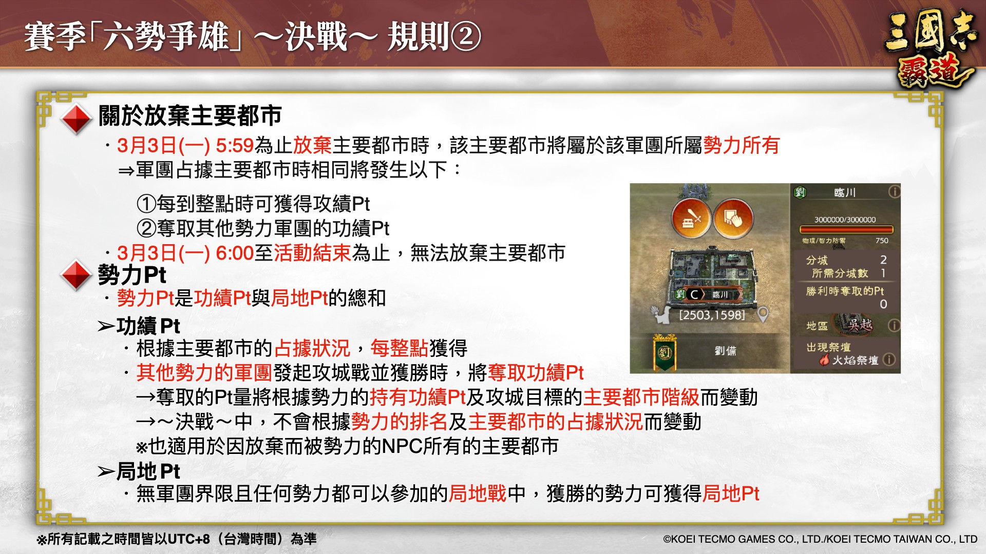 臺灣光榮特庫摩宣布,唯一由三國志系列之本家日本光榮特庫摩重磅推出MMO戰略模擬手機遊戲『三國志 霸道』,目前已完成2月更新,將於此介紹部分內容。此外,預計於3月15日(六)舉行的4.5週年線下主公同樂會的報名也已經開始,一併進行告知。 2月13日(四)起新賽季「六勢雄争」~決戰~開戰。在「熱鬥」中留下的2個勢力將持續爭奪勢力Pt。軍略方面,3個強力的S級軍略新登場,也追加了2個A級軍略。在局地戰中,夜晚的參戰人數增加成為最多50人參與的大規模戰鬥。 新LR武將「華陀」和「李牧」於極求賢令登場。 「LR華陀」可以在交戰中每隔一定時間賦予新有利變化「速癒」,可以解除弱化效果。同時也可以藉由戰法解除自身全部的弱化效果,並且回復所有負傷兵的輔助型弓兵武將。 「LR李牧」擁有隨著自身防禦而提升出征時的戰法量表的強力技能。同時也可以藉由戰法賦予新不利變化「碎心」,可以無效敵方戰法發生即時效果(強化解除/弱化解除等)的克制部隊型步兵武將。 同時,本次的更新中也實裝了新活動「迎擊戰」。利用「策略」來強化部隊或使戰況對自己有利,抵擋接連而來的敵人,保護本營。 此外,3月15日(六)將舉行4.5週年線下主公同樂會。屆時伊藤製作人將親臨台灣,與主公們來一場零距離的熱血交流大會。同樂會報名已經開始,詳情請參照遊戲內公告以及官方Facebook。 2月更新介紹 2025年2月13日(四) 新賽季「六勢爭雄」~決戰~! 賽季「六勢爭雄」~決戰~規則 賽季「六勢爭雄」~決戰~局地戰 賽季「六勢爭雄」~決戰~軍略 賽季「六勢爭雄」~決戰~報酬 LR武將「華陀」「李牧」登場 新LR武將「華陀」「李牧」於「極求賢令」登場 可以在交戰中每隔一定時間賦予新有利變化「速癒」,可以解除弱化效果。同時也可以藉由戰法解除自身全部的弱化效果,並且回復所有負傷兵的輔助型弓兵武將「LR華陀」。 擁有隨著自身防禦提升出征時戰法量表的強力技能。同時也可以藉由戰法賦予新不利變化「碎心」,可以無效敵方戰法發生即時效果(強化解除/弱化解除等)的克制部隊用步兵武將「LR李牧」。 新活動「迎擊戰」 ○活動名稱 三國志 霸道4.5週年線下主公同樂會 ○活動時間 2025年3月15日(六)下午 ※具體時間獲選後公佈 ○活動地點 雙北市某會場 ※具體地址日後公佈 ○活動嘉賓 【活動主持人】 安娜·李 【活動來賓】 『三國志 霸道』遊戲製作人 伊藤幸紀 『三國志 霸道』臺灣光榮特庫摩 董事暨副總經理 劉政和 『三國志 覇道』資深玩家UZ張耘芝 ○活動費用 完全免費 ※交通費、住宿費等由參加者自行承擔。 ※若活動被取消,本社將不做任何交通費或住宿費等任何賠償。 [...]