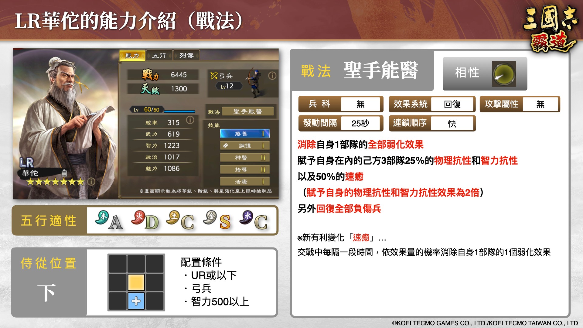 可以在交戰中每隔一定時間賦予新有利變化「速癒」,可以解除弱化效果。同時也可以藉由戰法解除自身全部的弱化效果,並且回復所有負傷兵的輔助型弓兵武將「LR華陀」。