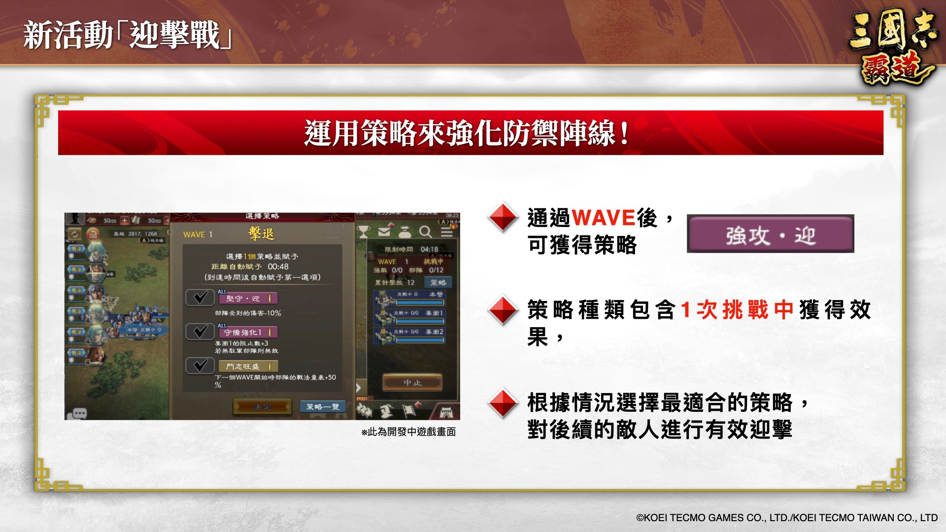 同時,本次的更新中也實裝了新活動「迎擊戰」。利用「策略」來強化部隊或使戰況對自己有利,抵擋接連而來的敵人,保護本營。