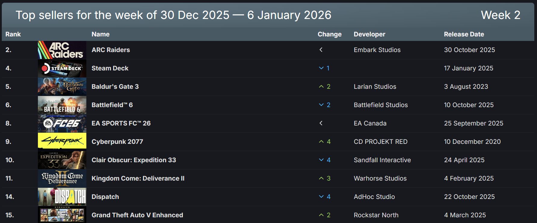 根據 SteamDB 公布的最新數據,2025 年 12 月 23 日至 12 月 30 日的 Steam 全球每週銷量排行榜已經出爐。 本週 Steam 銷量排行榜榜首依舊由 Embark Studios 打造的 PvPvE 撤離射擊作品《ARC Raiders》穩穩坐鎮。自上市以來,遊戲的玩家活躍度始終維持在高檔水準,社群討論熱度也居高不下,無論是實際遊玩人數還是話題聲量,都展現出難以撼動的人氣基礎,持續鞏固其榜首地位。 第二名則再次由 Valve 自家掌機 Steam Deck 拿下。即便上市已一段時間,這款掌上型 PC 仍維持穩定的銷售表現,長期佔據排行榜前段班,再次證明其在硬體市場中的耐久吸引力。 排名第三的,則是曾榮獲 TGA 年度遊戲、並曾長期稱霸榜首的 RPG 神作《柏德之門 3》。即使發售已久,本作依然展現出強勁的市場生命力,持續吸引新舊玩家回流,顯示其經典地位依舊難以撼動。 第四名由 EA 旗下老牌 FPS 系列最新作《戰地風雲 6》拿下。該作自推出以來便持續交出穩定銷量成績,本週同樣穩居排行榜前段班,成功吸引大量系列老玩家與新血回歸戰場。 至於第五名,則由 EA 長年熱門的運動足球系列最新作《EA SPORTS FC™ 26》入榜,延續系列一貫的高人氣與銷售動能,持續在競技運動類型中保持強勢存在感。